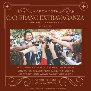 Join us at First Street Wine Company (2211 First Street, Downtown Livermore) on Thursday, March 12th from 5:00 – 7:30, for a special evening celebrating one of the most captivating grapes in the world — Cabernet Franc. Five of Livermore Valley’s premier wineries will each pour a featured Cabernet Franc, showcasing the range, character, and elegance of this dynamic varietal. Meet the winemakers. Compare styles. Discover your favorite.